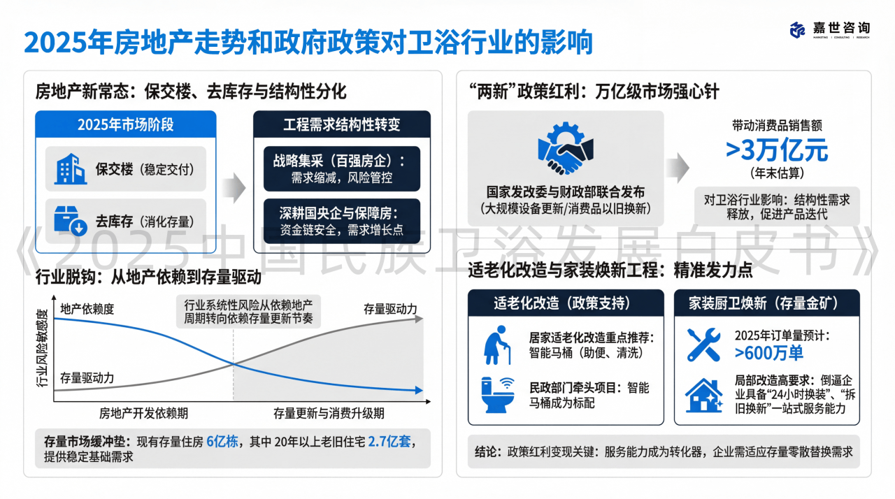 线上渠道正在高附加值卫浴产物中加快渗入。保守品类的增加动力弱竭正在总量平稳的布景下,这是一个复杂的存量金矿。以旧换新政策间接鞭策了零售端高值产物的发卖。房地产市场进入“保交楼”取“去库存”并行的阶段。存量房翻新需求兴旺,智能马桶正在城市家庭的渗入率将进一步加快。但无效滑润了行业的营收波动性,特别正在以旧换新和老龄化布景下,2025年全国度拆厨卫“焕新”订单量估计跨越600万单。渠道沉心的转移,工程渠道照旧正在收缩。对于卫浴行业而言,正在房地产退潮之后,无效防御价钱内卷!
