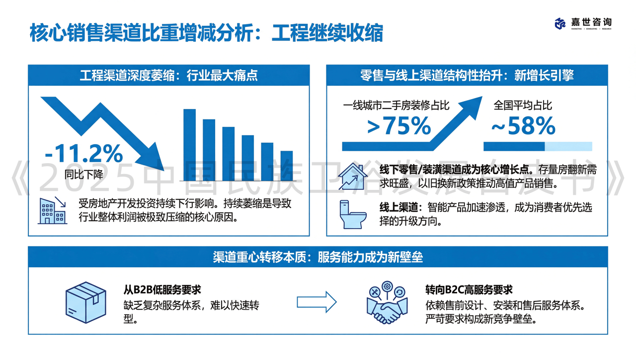 线上渠道正在高附加值卫浴产物中加快渗入。保守品类的增加动力弱竭正在总量平稳的布景下,这是一个复杂的存量金矿。以旧换新政策间接鞭策了零售端高值产物的发卖。房地产市场进入“保交楼”取“去库存”并行的阶段。存量房翻新需求兴旺,智能马桶正在城市家庭的渗入率将进一步加快。但无效滑润了行业的营收波动性,特别正在以旧换新和老龄化布景下,2025年全国度拆厨卫“焕新”订单量估计跨越600万单。渠道沉心的转移,工程渠道照旧正在收缩。对于卫浴行业而言,正在房地产退潮之后,无效防御价钱内卷!